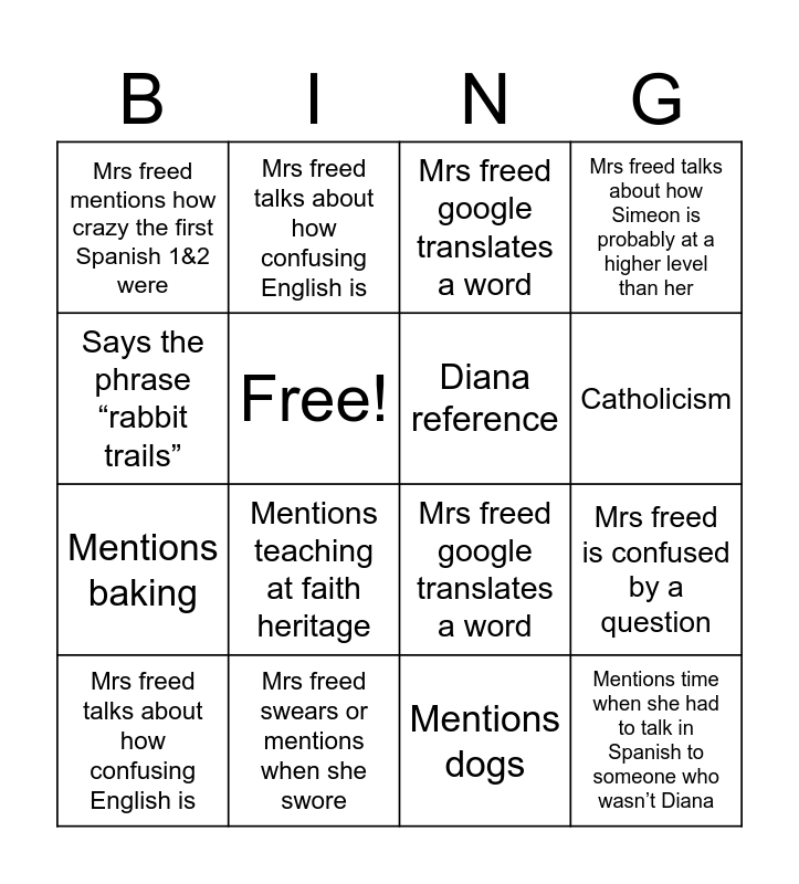 This bingo card has 17 words: Mentions dogs, Mrs freed talks about how confusing English is, Mrs freed google translates a word, Mrs freed mentions how crazy the first Spanish 1&2 were, Mentions teaching at faith heritage, Mrs freed talks about how Simeon is probably at a higher level than her, Mrs freed is confused by a question, Diana reference, Catholicism, Free!, Mrs freed swears or mentions when she swore, Mrs freed google translates a word, Says the phrase “rabbit trails”, Mrs freed talks about how confusing English is, Mentions baking, Mentions obscure trips and Mentions time when she had to talk in Spanish to someone who wasn’t Diana.