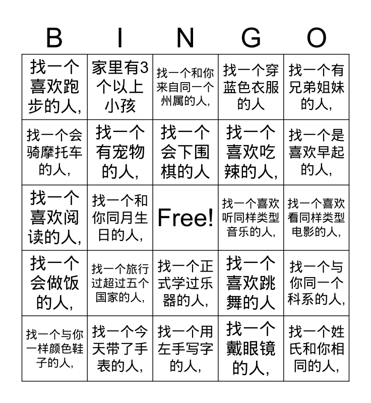 This bingo card has a free space and 29 words: 找一个与你一样颜色鞋子的人,, 找一个喜欢咖啡的人,, 找一个和你同月生日的人,, 找一个会说5种语言的人,, 找一个喜欢跑步的人,, 找一个和你来自同一个州属的人,, 找一个有宠物的人,, 找一个旅行过超过五个国家的人,, 找一个喜欢听同样类型音乐的人,, 找一个今天带了手表的人,, 找一个喜欢看同样类型电影的人,, 找一个姓氏和你相同的人,, 找一个用左手写字的人,, 找一个戴眼镜的人,, 找一个是喜欢早起的人,, 找一个喜欢雨天的人,, 找一个正式学过乐器的人,, 找一个会做饭的人,, 找一个有兄弟姐妹的人,, 找一个喜欢阅读的人,, 找一个喜欢跳舞的人, 找一个今年去健身房的人,, 找一个喜欢吃辣的人,, 找一个会骑摩托车的人,, 找一个穿蓝色衣服的人, 家里有3个以上小孩, 找一个与你同一个科系的人,, 找一个会下围棋的人 and 找一个会游泳的人..