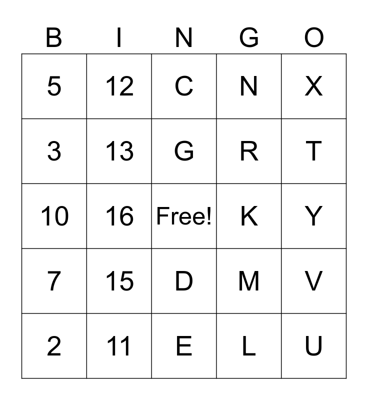 This bingo card has a free space and 46 words: 1, 11, A, J, T, 2, 12, B, K, U, 3, 13, L, V, 4, 14, C, M, W, 5, 15, D, N, X, 6, 16, E, O, Y, 7, 17, F, P, Z, 8, 18, G, Q, 9, 19, H, R, 10, 20, I and S.