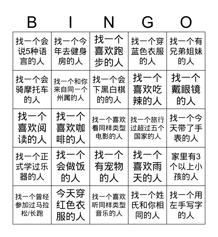 This bingo card has 30 words: 今天穿红色衣服的人, 找一个与你一样颜色鞋子的人, 找一个喜欢咖啡的人, 找一个和你同月生日的人, 找一个会说5种语言的人, 找一个喜欢跑步的人, 找一个和你来自同一个州属的人, 找一个有宠物的人, 找一个旅行过超过五个国家的人, 找一个喜欢听同样类型音乐的人, 找一个今天带了手表的人, 找一个喜欢看同样类型电影的人, 找一个姓氏和你相同的人, 找一个用左手写字的人, 找一个戴眼镜的人, 找一个是喜欢早起的人, 找一个喜欢雨天的人, 找一个正式学过乐器的人, 找一个会做饭的人, 找一个有兄弟姐妹的人, 找一个喜欢阅读的人, 找一个喜欢跳舞的人, 找一个今年去健身房的人, 找一个喜欢吃辣的人, 找一个会骑摩托车的人, 找一个穿蓝色衣服的人, 家里有3个以上小孩的人, 找一个曾经参加过马拉松/长跑, 找一个会下黑白棋的的人 and 找一个会游泳的人.
