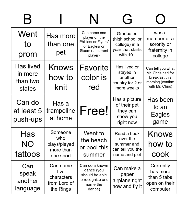 This bingo card has a free space and 24 words: Someone who plays/played more than one sport, Can name five characters from Lord of the Rings, Favorite color is red, Can speak another language, was a member of a sorority or fraternity in college, Went to prom, Has lived in more than two states, Has more than one pet, Has a picture of their pet they can show you right now, Went to the beach or pool this summer, Has lived or stayed in another country for 2 or more weeks, Can do at least 5 push-ups, Read a book over the summer and can tell you the name and plot, Knows how to cook, Knows how to knit, Can make a paper airplane right now and fly it, Has been to an Eagles game, Can name one player on the Phillies/ or Flyers/ or Eagles/ or Sixers ( a current player), Can tell you what Mr. Chris had for breakfast this morning (confirm with Mr. Chris), Has a trampoline at home, Currently has more than 5 tabs open on their computer, Has NO tattoos, Graduated (high school or college) in a year that starts with 19.. and Can do a known dance (you should be able to recognize and name the dance).