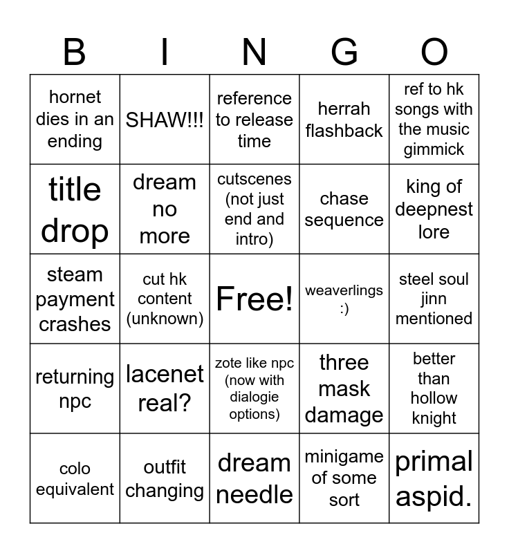 This bingo card has a free space and 24 words: lacenet real?, outfit changing, cutscenes (not just end and intro), colo equivalent, ref to hk songs with the music gimmick, hornet dies in an ending, title drop, SHAW!!!, weaverlings :), zote like npc (now with dialogie options), chase sequence, steam payment crashes, three mask damage, better than hollow knight, dream no more, minigame of some sort, steel soul jinn mentioned, reference to release time, king of deepnest lore, cut hk content (unknown), primal aspid., returning npc, herrah flashback and dream needle.