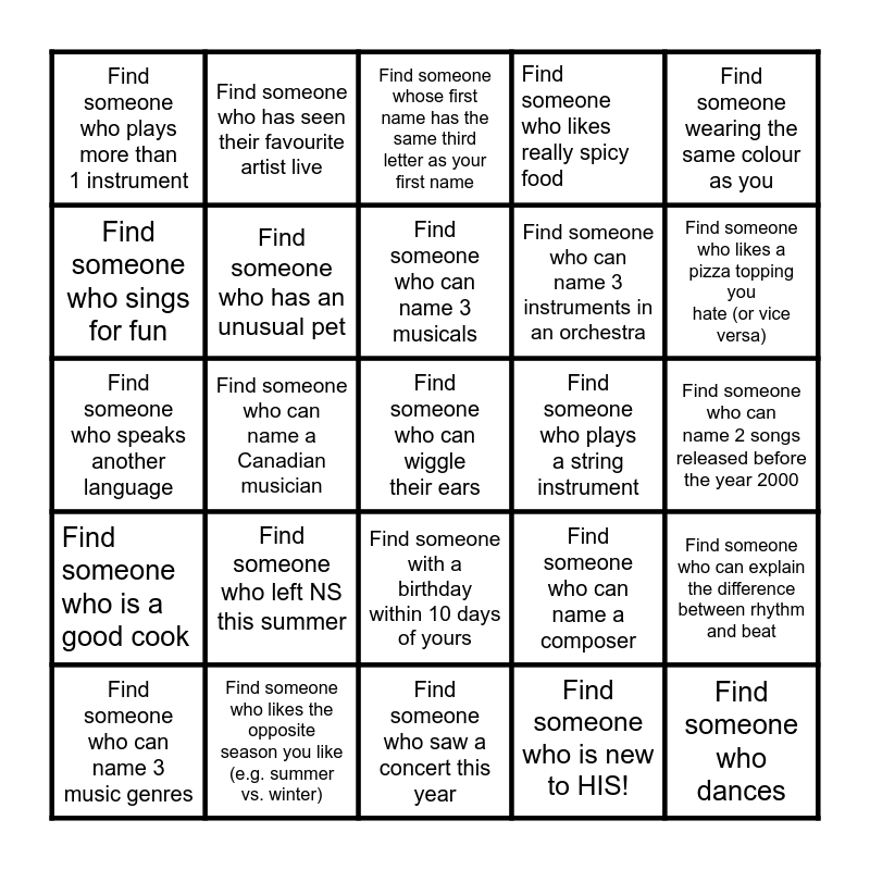 This bingo card has 25 words: Find someone who left NS this summer, Find someone who saw a concert this year, Find someone who can name 3 musicals, Find someone who can name 3 music genres, Find someone wearing the same colour as you, Find someone who plays more than 1 instrument, Find someone who sings for fun, Find someone who has seen their favourite artist live, Find someone who plays a string instrument, Find someone with a birthday within 10 days of yours, Find someone who can name 3 instruments in an orchestra, Find someone who speaks another language, Find someone who can name a composer, Find someone who can explain the difference between rhythm and beat, Find someone who has an unusual pet, Find someone who dances, Find someone who can name 2 songs released before the year 2000, Find someone whose first name has the same third letter as your first name, Find someone who likes a pizza topping you hate (or vice versa), Find someone who can name a Canadian musician, Find someone who can wiggle their ears, Find someone who likes the opposite season you like (e.g. summer vs. winter), Find someone who is a good cook, Find someone who likes really spicy food and Find someone who is new to HIS!.