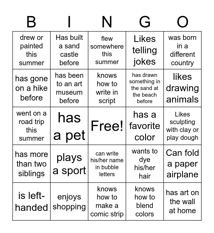 This bingo card has a free space and 29 words: is left-handed, can name a famous artist, has a pet, knows the primary colors, drew or painted this summer, flew somewhere this summer, has been to an art museum before, plays a sport, has a favorite color, enjoys shopping, Likes sculpting with clay or play dough, has art on the wall at home, knows how to make a comic strip, knows how to blend colors, likes drawing animals, likes drawing flowers, can write his/her name in bubble letters, has more than two siblings, was born in a different country, went on a road trip this summer, wants to dye his/her hair, speaks a language other than English, has drawn something in the sand at the beach before, has gone on a hike before, Likes telling jokes, Has built a sand castle before, Can fold a paper airplane, knows how to write in script and enjoys travelling.