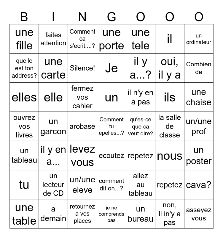 This bingo card has a free space and 55 words: un bureau, une chaise, une fenetre, une fille, un garcon, un lecteur de CD, un ordinateur, une chaise, une carte, un/une eleve, une porte, un poster, un/une prof, la salle de classe, une table, un tableau, une tele, il y a...?, non, ll in'y a pas, oui, il y a, Combien de, il y en a..., il n'y en a pas, Comment ca s'ecrit,...?, Ca s'ecrit, quelle est ton address?, arobase, c'est... arobase... point, elles, ils, vous, nous, cava?, a demain, il, Je, tu, elle, asseyez vous, levez vous, faites attention, comment dit on...?, allez au tableau, regardez, fermez vos cahier, ouvrez vos livres, retournez a vos places, repetez, qu'es-ce que ca veut dire?, Silence!, ecoutez, repetez, je ne comprends pas, un and une.