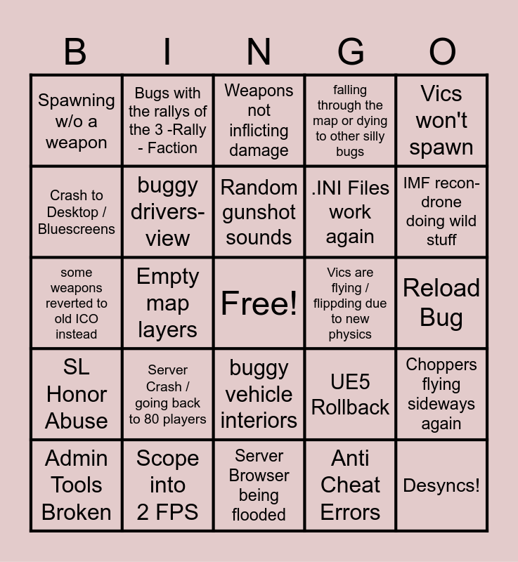 This bingo card has a free space and 24 words: Server Crash / going back to 80 players, Scope into 2 FPS, Random gunshot sounds, Admin Tools Broken, Vics won't spawn, Spawning w/o a weapon, Crash to Desktop / Bluescreens, Bugs with the rallys of the 3 -Rally - Faction, Vics are flying / flippding due to new physics, buggy vehicle interiors, .INI Files work again, some weapons reverted to old ICO instead, UE5 Rollback, Choppers flying sideways again, buggy drivers- view, Anti Cheat Errors, Reload Bug, Weapons not inflicting damage, IMF recon-drone doing wild stuff, Empty map layers, Desyncs!, SL Honor Abuse, falling through the map or dying to other silly bugs and Server Browser being flooded.