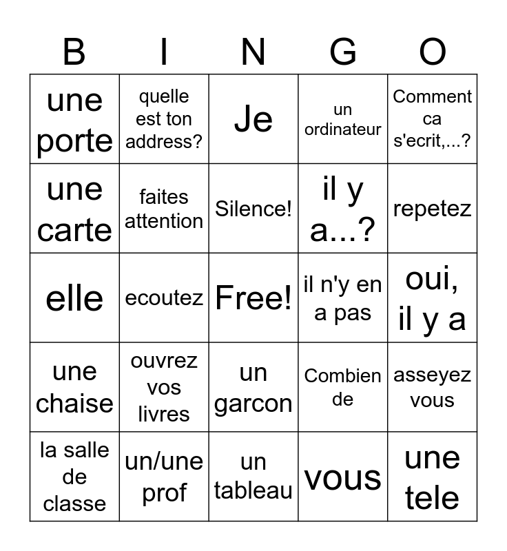 This bingo card has a free space and 54 words: un bureau, une chaise, une fenetre, une fille, un garcon, un lecteur de CD, un ordinateur, une chaise, une carte, un/une eleve, une porte, un poster, un/une prof, la salle de classe, une table, un tableau, une tele, il y a...?, non, ll in'y a pas, oui, il y a, Combien de, il y en a..., il n'y en a pas, Comment ca s'ecrit,...?, Ca s'ecrit, quelle est ton address?, arobase, c'est... arobase...point, elles, ils, vous, nous, cava?, a demain, il, Je, tu, elle, asseyez vous, levez vous, faites attention, comment dit on...?, allez au tableau, regardez, fermez vos cahier, ouvrez vos livres, retournez a vos places, repetez, qu'es-ce que ca veut dire?, Silence!, ecoutez, repetez, je ne comprends pas, un and une.