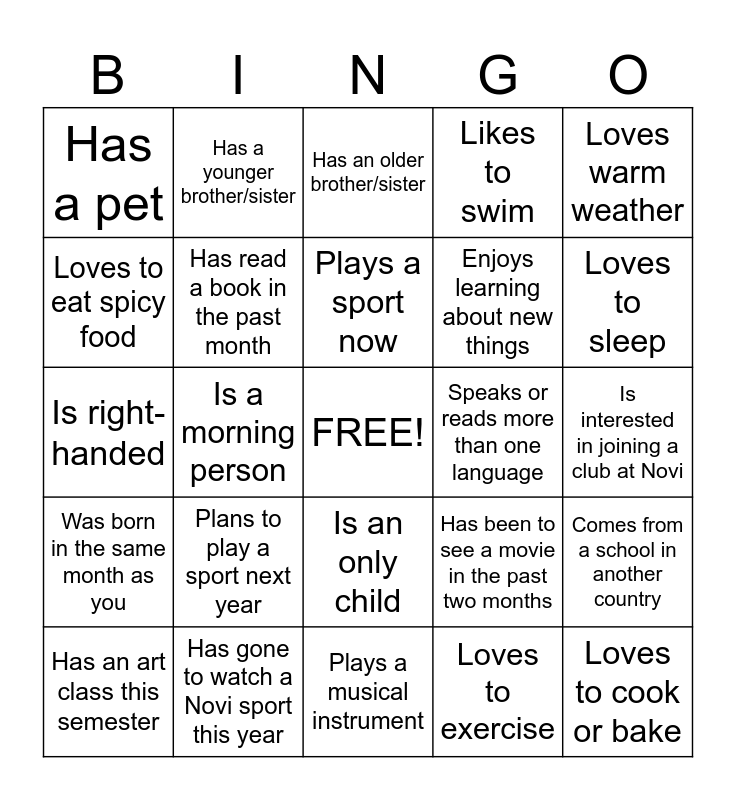 This bingo card has a free space and 24 words: Has an art class this semester, Plans to play a sport next year, Plays a sport now, Loves to exercise, Loves warm weather, Has a pet, Has a younger brother/sister, Has an older brother/sister, Speaks or reads more than one language, Is interested in joining a club at Novi, Is right-handed, Has read a book in the past month, Has been to see a movie in the past two months, Comes from a school in another country, Loves to eat spicy food, Has gone to watch a Novi sport this year, Plays a musical instrument, Likes to swim, Loves to sleep, Was born in the same month as you, Is a morning person, Is an only child, Enjoys learning about new things and Loves to cook or bake.