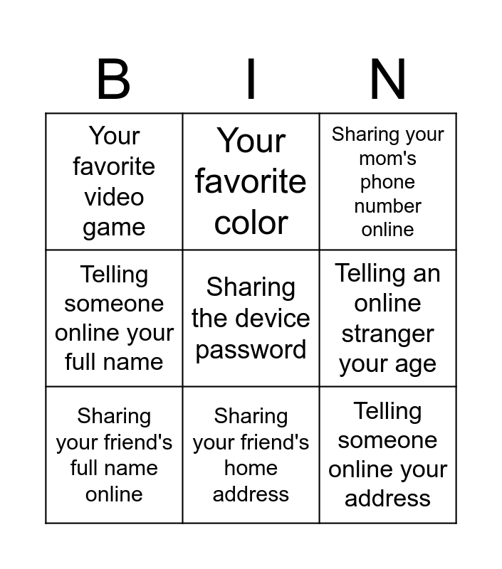 This bingo card has 18 words: Sharing your password with a friend, Telling a classmate your birthday, Sharing your mom's phone number online, Your favorite video game, Your pet's name, Telling someone online your full name, Your home address, Your favorite color, Sharing your friend's home address, Telling someone online your address, Your favorite movie, Sharing the device password, Your favorite food, Telling an online stranger your age, Sharing your friend's full name online, Your friend's favorite ice cream flavor, Your friend's dog's name and Sharing your parent's bank details.