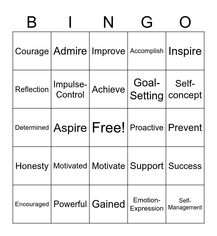 This bingo card has a free space and 24 words: Encouraged, Motivated, Achieve, Emotion-Expression, Inspire, Courage, Admire, Improve, Proactive, Prevent, Determined, Impulse- Control, Support, Success, Reflection, Powerful, Gained, Accomplish, Self-concept, Honesty, Aspire, Motivate, Goal-Setting and Self-Management.