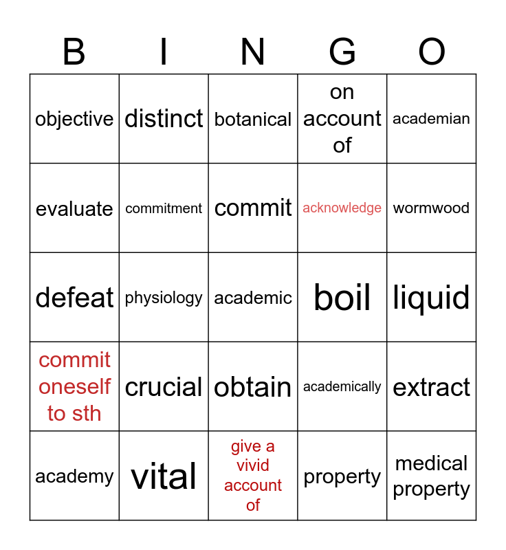 This bingo card has a free space and 24 words: crucial, vital, commit, academy, academian, objective, evaluate, distinct, boil, obtain, acknowledge, defeat, academically, extract, commitment, property, liquid, botanical, wormwood, physiology, medical property, commit oneself to sth, on account of and give a vivid account of.