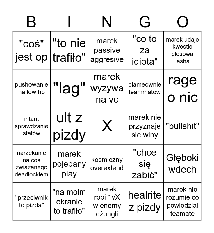 This bingo card has a free space and 28 words: Głęboki wdech, ktokolwiek ma "zły" build, blameownie teammatow, healrite z pizdy, pushowanie na low hp, marek passive aggresive, "to nie trafiło", narzekanie na cos związanego deadlockiem, marek nie przyznaje sie winy, "przeciwnik to pizda", intant sprawdzanie statów, "co to za idiota", "na moim ekranie to trafiło", marek robi 1vX w enemy dżungli, rage o nic, "ale on ma farta", marek pojebany play, "lag", marek wyzywa na vc, kosmiczny overextend, "coś" jest op, "statlocker znowu nie działą", marek nie rozumie co powiedział teamate, ult z pizdy, "bullshit", "chce się zabić", marek udaje kwestie głosowa lasha and "chłopcze".