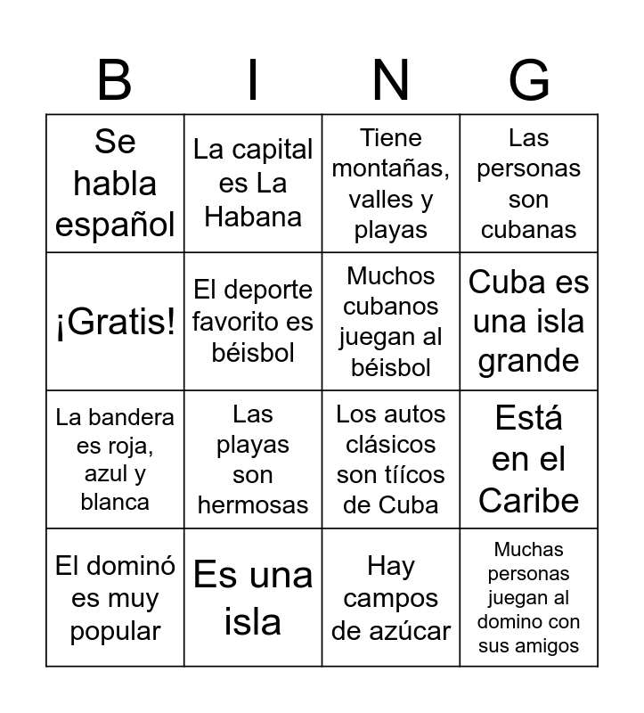 This bingo card has 16 words: Es una isla, Está en el Caribe, Tiene montañas, valles y playas, Se habla español, La bandera es roja, azul y blanca, La capital es La Habana, Los autos clásicos son tíícos de Cuba, Hay campos de azúcar, ¡Gratis!, El deporte favorito es béisbol, El dominó es muy popular, Las personas son cubanas, Las playas son hermosas, Cuba es una isla grande, Muchos cubanos juegan al béisbol and Muchas personas juegan al domino con sus amigos.