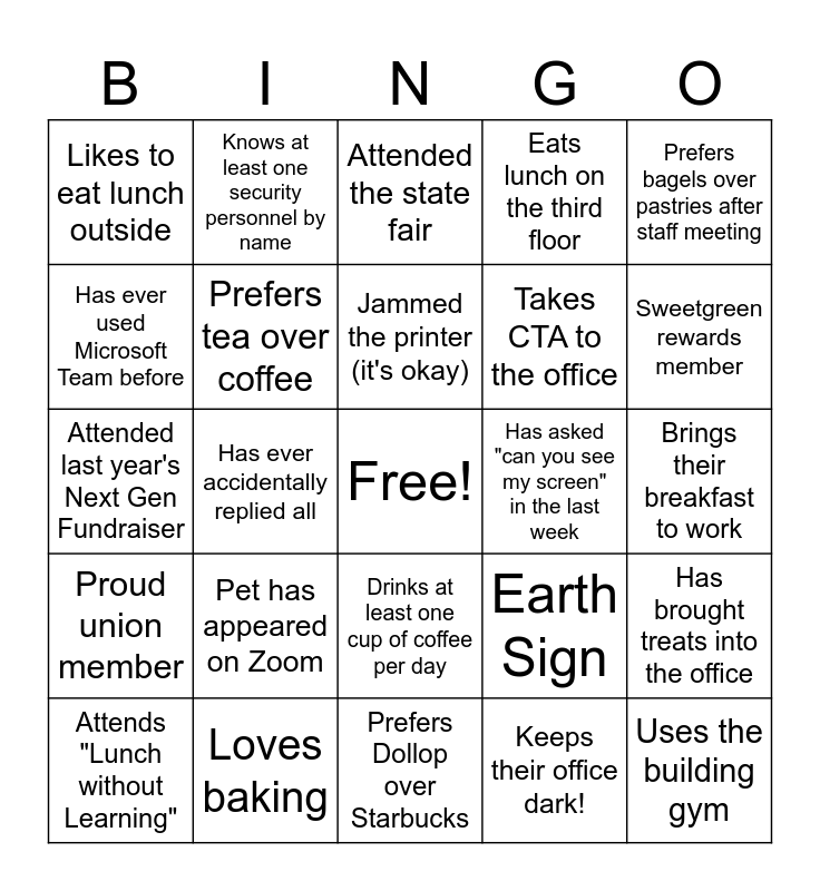 This bingo card has a free space and 24 words: Pet has appeared on Zoom, Loves baking, Jammed the printer (it's okay), Attends "Lunch without Learning", Prefers bagels over pastries after staff meeting, Likes to eat lunch outside, Has ever used Microsoft Team before, Knows at least one security personnel by name, Has asked "can you see my screen" in the last week, Drinks at least one cup of coffee per day, Takes CTA to the office, Attended last year's Next Gen Fundraiser, Earth Sign, Has brought treats into the office, Prefers tea over coffee, Keeps their office dark!, Brings their breakfast to work, Attended the state fair, Sweetgreen rewards member, Has ever accidentally replied all, Uses the building gym, Proud union member, Eats lunch on the third floor and Prefers Dollop over Starbucks.