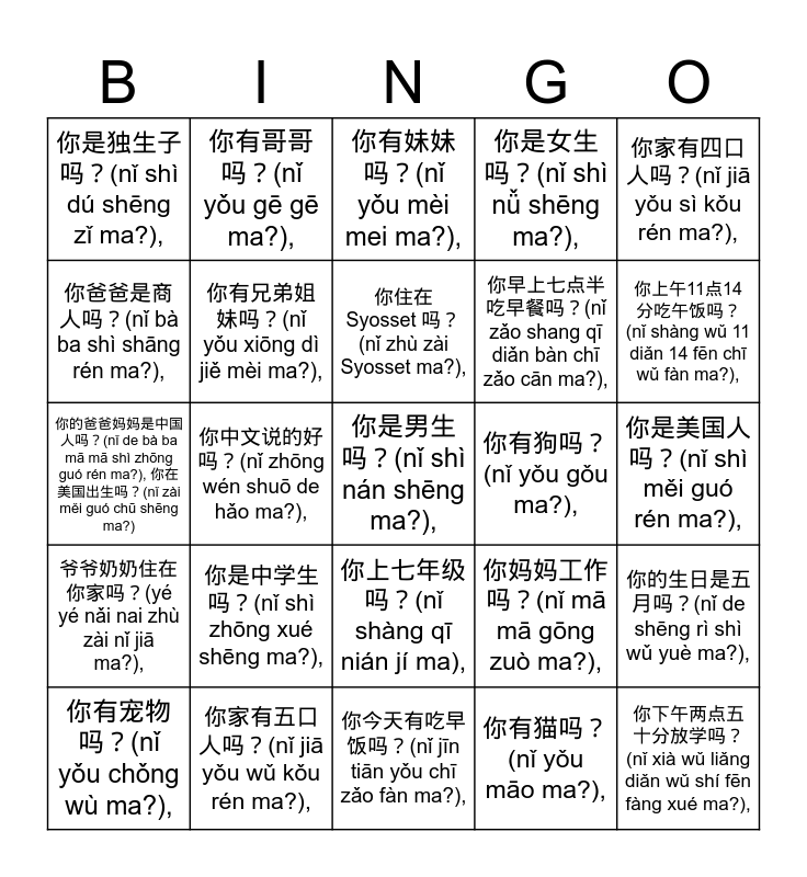 This bingo card has 39 words: 你的生日是九月吗?(nǐ de shēng rì shì jiǔ yuè ma?),, 你去过中国吗?(nǐ qù guò zhōng guó ma?),, 你今年十二岁吗?(nǐ jīn nián shí èr suì ma?),, 你有兄弟姐妹吗?(nǐ yǒu xiōng dì jiě mèi ma?),, 你有宠物吗?(nǐ yǒu chǒng wù ma?),, 你上七年级吗?(nǐ shàng qī nián jí ma),, 你住在Syosset 吗?(nǐ zhù zài Syosset ma?),, 你在中国出生吗?(nǐ zài zhōng guó chū shēng ma?),, 你家有四口人吗?(nǐ jiā yǒu sì kǒu rén ma?),, 爷爷奶奶住在你家吗?(yé yé nǎi nai zhù zài nǐ jiā ma?),, 你中文说的好吗?(nǐ zhōng wén shuō de hǎo ma?),, 你是女生吗?(nǐ shì nǚ shēng ma?),, 你是男生吗?(nǐ shì nán shēng ma?),, 你是美国人吗?(nǐ shì měi guó rén ma?),, 你有狗吗?(nǐ yǒu gǒu ma?),, 你是中学生吗?(nǐ shì zhōng xué shēng ma?),, 你是独生女吗?(nǐ shì dú shēng nǚ ma?),, 你是独生子吗?(nǐ shì dú shēng zǐ ma?),, 你爸爸工作吗?(nǐ bà ba gōng zuò ma?),, 你妈妈工作吗?(nǐ mā mā gōng zuò ma?),, 你爸爸是商人吗?(nǐ bà ba shì shāng rén ma?),, 你今天有吃早饭吗?(nǐ jīn tiān yǒu chī zǎo fàn ma?),, 你早上七点半吃早餐吗?(nǐ zǎo shang qī diǎn bàn chī zǎo cān ma?),, 你上午11点14分吃午饭吗?(nǐ shàng wǔ 11 diǎn 14 fēn chī wǔ fàn ma?),, 你住在纽约吗?(nǐ zhù zài niǔ yuē ma?),, 你早上八点上学吗?(nǐ zǎo shang bā diǎn shàng xué ma?),, 你下午两点五十分放学吗?(nǐ xià wǔ liǎng diǎn wǔ shí fēn fàng xué ma?),, 你晚上九点睡觉吗?(nǐ wǎn shàng jiǔ diǎn shuì jiào ma?),, 你喜欢上中文课吗?(nǐ xǐ huān shàng zhōng wén kè ma?),, 你有哥哥吗?(nǐ yǒu gē gē ma?),, 你有弟弟吗?(nǐ yǒu dì dì ma?),, 你有姐姐吗?(nǐ yǒu jiě jiě ma?),, 你有妹妹吗?(nǐ yǒu mèi mei ma?),, 你家有五口人吗?(nǐ jiā yǒu wǔ kǒu rén ma?),, 你有猫吗?(nǐ yǒu māo ma?),, 你的生日是十二月吗?(nǐ de shēng rì shì shí èr yuè ma?),, 你的生日是五月吗?(nǐ de shēng rì shì wǔ yuè ma?),, 你的爸爸妈妈是中国人吗?(nǐ de bà ba mā mā shì zhōng guó rén ma?), 你在美国出生吗?(nǐ zài měi guó chū shēng ma?) and 你晚上十点睡觉吗?(nǐ wǎn shàng shí diǎn shuì jiào ma?).