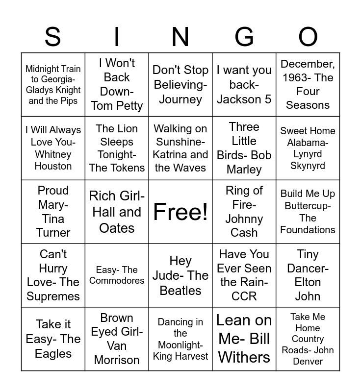 This bingo card has a free space and 34 words: My Girl- The Temptations, Lean on Me- Bill Withers, Stand By Me- Ben E King, Ain't No Mountain- Marvin Gaye, Can't Hurry Love- The Supremes, The Lion Sleeps Tonight- The Tokens, December, 1963- The Four Seasons, Take it Easy- The Eagles, I Won't Back Down- Tom Petty, Under the Boardwalk- The Drifters, Walking on Sunshine- Katrina and the Waves, Don't Stop Believing- Journey, Sweet Caroline- Neil Diamond, Can't Help Falling In Love- Elvis Presley, Ring of Fire- Johnny Cash, Sweet Home Alabama- Lynyrd Skynyrd, Brown Eyed Girl- Van Morrison, Proud Mary- Tina Turner, Easy- The Commodores, Have You Ever Seen the Rain- CCR, Hey Jude- The Beatles, Twist and Shout-The Beatles, Midnight Train to Georgia- Gladys Knight and the Pips, Build Me Up Buttercup- The Foundations, Dancing in the Moonlight- King Harvest, Take Me Home Country Roads- John Denver, I want you back- Jackson 5, Don't Worry, Be Happy- Bobby McFerrin, Three Little Birds- Bob Marley, I Will Always Love You- Whitney Houston, Twist and Shout- The Beatles, Rich Girl- Hall and Oates, Tiny Dancer- Elton John and Piano Man- Billy Joel.