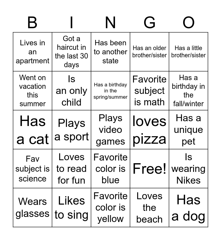 This bingo card has 25 words: Loves to read for fun, Favorite color is yellow, Has a birthday in the spring/summer, Wears glasses, Has a little brother/sister, Lives in an apartment, Went on vacation this summer, Got a haircut in the last 30 days, loves pizza, Favorite color is blue, Favorite subject is math, Has a cat, Free!, Is wearing Nikes, Is an only child, Has a dog, Has a unique pet, Has been to another state, Has a birthday in the fall/winter, Plays a sport, Plays video games, Likes to sing, Fav subject is science, Has an older brother/sister and Loves the beach.