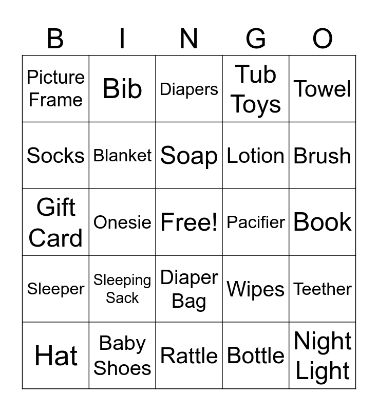 This bingo card has a free space and 25 words: Sleeper, Baby Shoes, Rattle, Bottle, Towel, Picture Frame, Bib, Diapers, Pacifier, Teether, Socks, Blanket, Stuffie, Wipes, Brush, Hat, Onesie, Soap, Lotion, Book, Gift Card, Sleeping Sack, Diaper Bag, Tub Toys and Night Light.