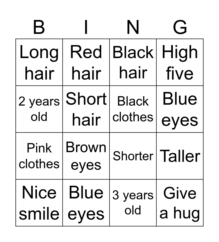 This bingo card has 18 words: Brown eyes, Give a hug, Black hair, Long hair, Shorter, High five, Nice smile, Red hair, Blue eyes, Pink clothes, 3 years old, 2 years old, Taller, Short hair, Black clothes, Blonde hair, Blue eyes and Hug.