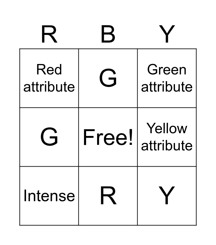 This bingo card has a free space and 13 words: Concise, Chit Chat, Intense, G, G, Y, R, B, R, Red attribute, Yellow attribute, Green attribute and Blue attribute.