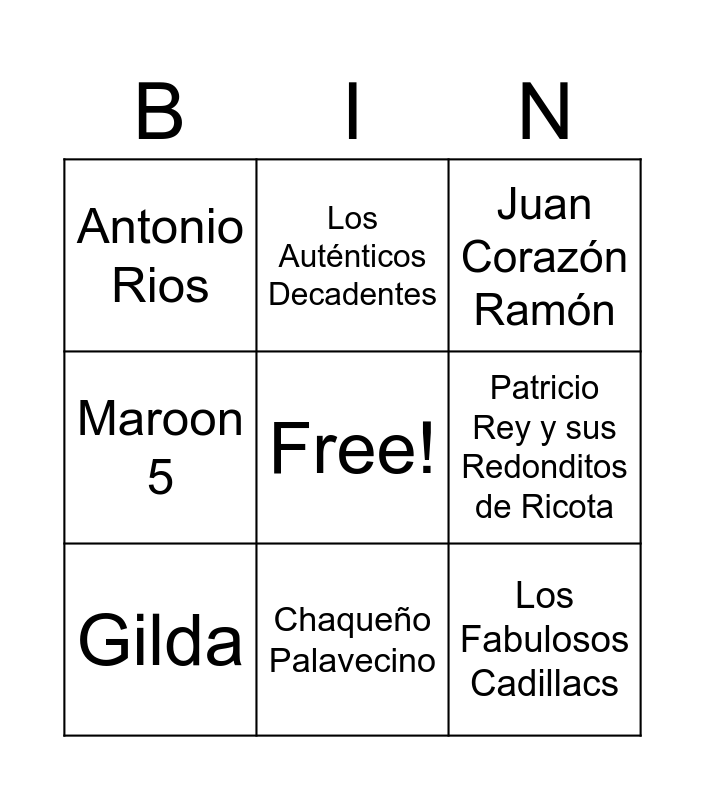 This bingo card has a free space and 29 words: Oasis, Zoe Gotusso, Billie Eilish, Ke Personaje, Antonio Rios, Juan Corazón Ramón, Gilda, Los Angeles Azules, Luck Ra, Charly García, Luis Alberto Spinetta, The Police, Michael Jackson, Madonna, Guns N’ Roses, Soda Stereo, Prince, Metallica, Los Fabulosos Cadillacs, Coldplay, Calle 13, Miranda!, Trueno, Patricio Rey y sus Redonditos de Ricota, Maroon 5, Los Auténticos Decadentes, Lali, Chaqueño Palavecino and The cure.