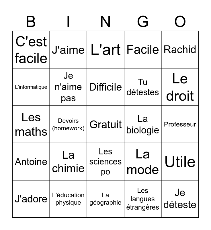 This bingo card has a free space and 24 words: La chimie, L'éducation physique, Difficile, J'adore, Rachid, C'est facile, L'informatique, J'aime, La biologie, Les sciences po, Tu détestes, Les maths, La mode, Utile, Je n'aime pas, Les langues étrangères, Professeur, L'art, Le droit, Devoirs (homework), Je déteste, Antoine, Facile and La géographie.