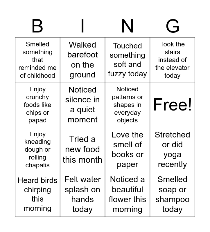 This bingo card has 17 words: Noticed a beautiful flower this morning, Heard birds chirping this morning, Touched something soft and fuzzy today, Smelled something that reminded me of childhood, Tried a new food this month, Took the stairs instead of the elevator today, Stretched or did yoga recently, Noticed patterns or shapes in everyday objects, Free!, Noticed silence in a quiet moment, Felt water splash on hands today, Love the smell of books or paper, Enjoy crunchy foods like chips or papad, Walked barefoot on the ground, Enjoy kneading dough or rolling chapatis, Enjoy riding a bicycle or scooter and Smelled soap or shampoo today.