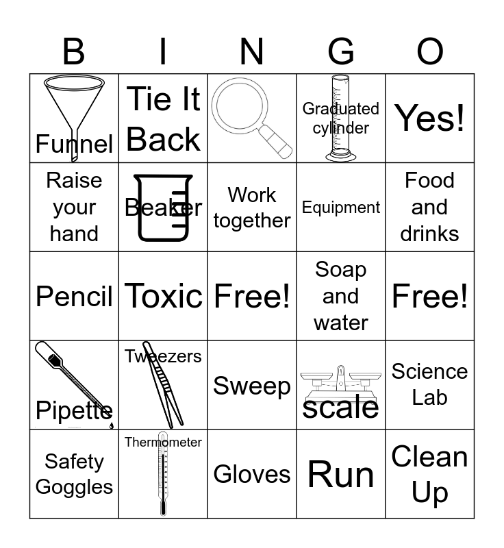 This bingo card has 8 images, a free space and 26 words: scale, Quietly, Equipment, Gloves, Raise your hand, Tie It Back, Pipette, Soap and water, Science Lab, Pencil, Graduated cylinder, Safety Goggles, Thermometer, Food and drinks, Lab Safety, Beaker, Work together, Tweezers, Funnel, Free!, Run, Toxic, Clean Up, Sweep, Yes! and Unsafe.