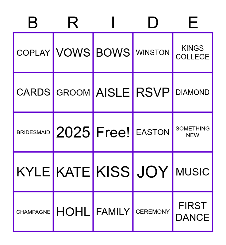 This bingo card has a free space and 84 words: TUXEDO, RINGS, AISLE, YANKEES, DRESS, BEST MAN, SAVE THE DATE, INVITATIONS, RING BEARER, FIRST DANCE, VEIL, CENTERPIECES, EASTON, MUSIC, BRIDAL SHOWER, VOWS, BRIDE, RSVP, BOUTONNIERE, SOMETHING OLD, I DO, FAMILY, CEREMONY, CAKE, COPLAY, REHERSAL, TOAST, ALTAR, PHOTOS, MAID OF HONOR, GROOM, GIANTS, ENGAGEMENT, SOMETHING NEW, CHAMPAGNE, RECEPTION, LOVE, HONEYMOON, DIAMOND, BRIDESMAID, SAID YES, FUTURE MRS., GROOMSMAN, LICENSE, FRIENDS, LONG VALLEY, BOWS, CHURCH, HUSBAND, SOMETHING BORROWED, DECEMBER, KISS, WINSTON, GUESTS, BOUQUET, THANK YOU NOTES, FLOWERS, JOY, PROCESSIONAL, CARDS, Phillies, MARRIAGE, PROPOSAL, MORAVIAN UNIVERSITY, SOMETHING BLUE, HUGS, COCKTAIL HOUR, BELLS, KINGS COLLEGE, EAGLES, 2025, HOTEL BETHLEHEM, WIFE, UNION, KYLE, KATE, GIFTS, DANCE, PARTY TIME, WINTER WEDDING, HOHL, GULDNER, NEWLYWEDS and KATE'S TYING THE KNOT.
