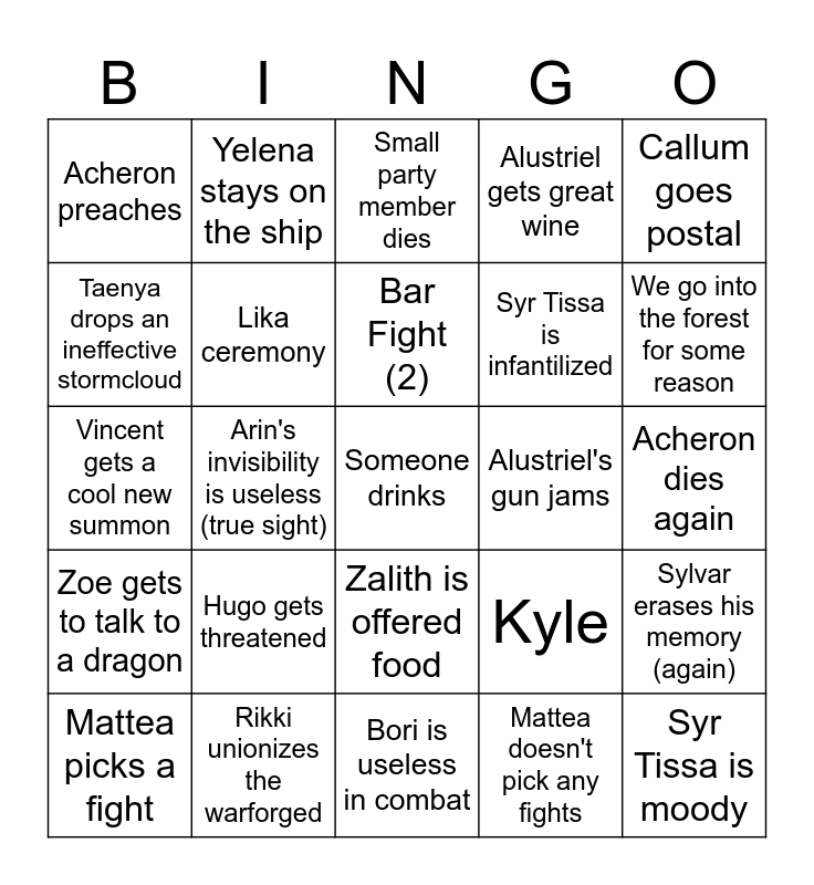This bingo card has a free space and 24 words: Hugo gets threatened, Rikki unionizes the warforged, Bar Fight (2), Mattea picks a fight, Callum goes postal, Acheron preaches, Taenya drops an ineffective stormcloud, Yelena stays on the ship, Alustriel's gun jams, Zalith is offered food, Syr Tissa is infantilized, Vincent gets a cool new summon, Kyle, Sylvar erases his memory (again), Lika ceremony, Mattea doesn't pick any fights, Acheron dies again, Small party member dies, We go into the forest for some reason, Arin's invisibility is useless (true sight), Syr Tissa is moody, Zoe gets to talk to a dragon, Alustriel gets great wine and Bori is useless in combat.