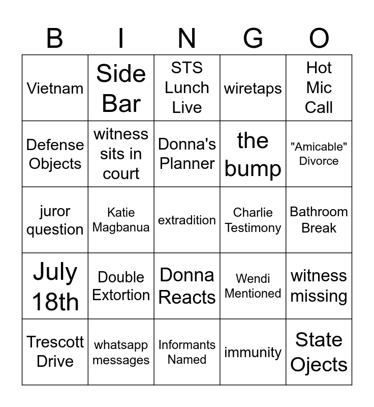 This bingo card has 25 words: Double Extortion, Informants Named, Donna's Planner, Trescott Drive, Hot Mic Call, Vietnam, Defense Objects, Side Bar, Charlie Testimony, Donna Reacts, the bump, juror question, Wendi Mentioned, witness missing, witness sits in court, State Ojects, Bathroom Break, STS Lunch Live, "Amicable" Divorce, Katie Magbanua, extradition, whatsapp messages, July 18th, wiretaps and immunity.