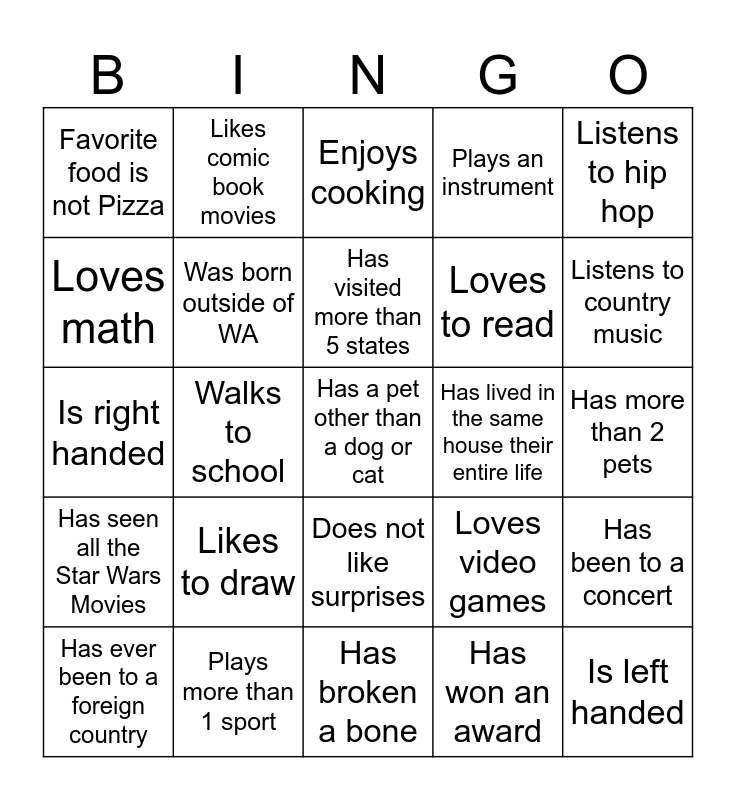 This bingo card has a free space and 29 words: Has ever been to a foreign country, Has thrown-up at school, Walks to school, Has more than 2 siblings, Favorite food is not Pizza, Enjoys cooking, Was born outside of WA, Likes to draw, Has lived in the same house their entire life, Plays more than 1 sport, Has more than 2 pets, Is left handed, Has broken a bone, Has won an award, Listens to country music, Loves to dance, Does not like surprises, Has seen all the Star Wars Movies, Listens to hip hop, Is right handed, Loves video games, Has tried sushi, Loves to read, Loves math, Plays an instrument, Likes comic book movies, Has been to a concert, Has visited more than 5 states and Has used power tools.