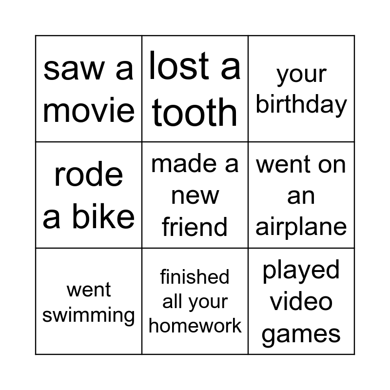 This bingo card has 9 words: went swimming, your birthday, lost a tooth, rode a bike, saw a movie, went on an airplane, made a new friend, played video games and finished all your homework.