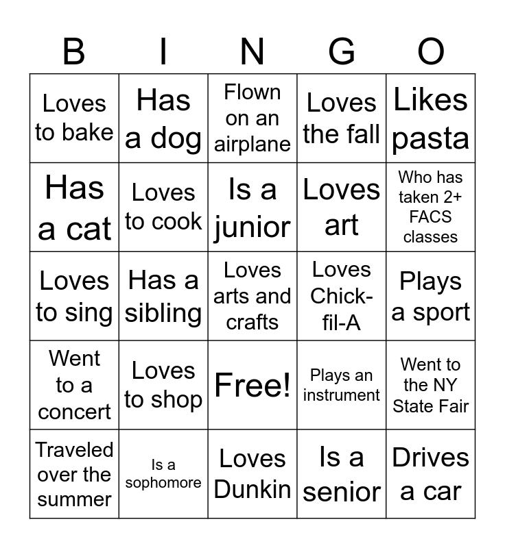 This bingo card has 26 words: Free!, Is a senior, Is a junior, Is a sophomore, Likes pasta, Loves to bake, Has a cat, Has a dog, Plays a sport, Plays an instrument, Loves art, Loves to sing, Went to the NY State Fair, Traveled over the summer, Has a sibling, Is an only child, Loves the fall, Went to a concert, Flown on an airplane, Loves arts and crafts, Who has taken 2+ FACS classes, Loves Dunkin, Loves Chick-fil-A, Loves to shop, Loves to cook and Drives a car.