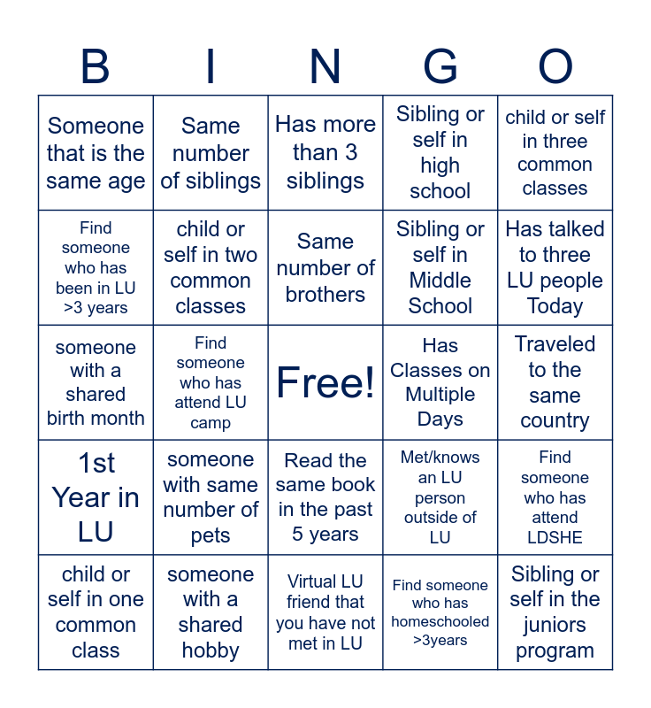 This bingo card has a free space and 34 words: Went to Public School, Find someone who has homeschooled >3years, Find someone who has homeschooled >2 years, Never went to Public School, 1st Year in LU, child or self in two common classes, child or self in three common classes, child or self in one common class, Same number of siblings, Same number of sisters, Same number of brothers, Has more than 3 siblings, Has a sibling over 18, Has a sibling or self with ADHD, Has Classes on Multiple Days, Has talked to three LU people Today, someone with a shared hobby, someone with a shared birth month, someone with same number of pets, Met/knows an LU person outside of LU, Read the same book in the past 5 years, Lived in the same state, Someone that is the same age, Traveled to the same country, Virtual LU friend that you have not met in LU, Sibling or self in the juniors program, Sibling or self in high school, Sibling who has graduated, Sibling or self in Middle School, Find someone who has been in LU >3 years, Find someone who has been in LU >4 years, Find someone who has attend LU camp, Find someone who has attend LDSHE and Find someone who has been in LU >1 years.