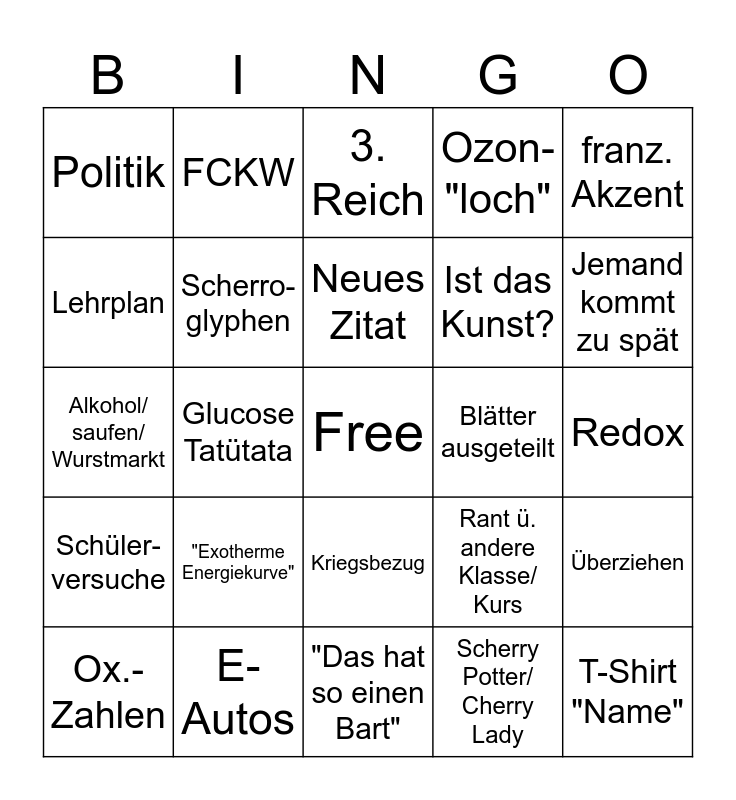 This bingo card has a free space and 24 words: "Exotherme Energiekurve", E-Autos, Neues Zitat, Ox.-Zahlen, franz. Akzent, Politik, Lehrplan, FCKW, Blätter ausgeteilt, Kriegsbezug, Ist das Kunst?, Alkohol/ saufen/ Wurstmarkt, Rant ü. andere Klasse/ Kurs, Überziehen, Scherro-glyphen, Scherry Potter/ Cherry Lady, Redox, 3. Reich, Jemand kommt zu spät, Glucose Tatütata, T-Shirt "Name", Schüler-versuche, Ozon- "loch" and "Das hat so einen Bart".