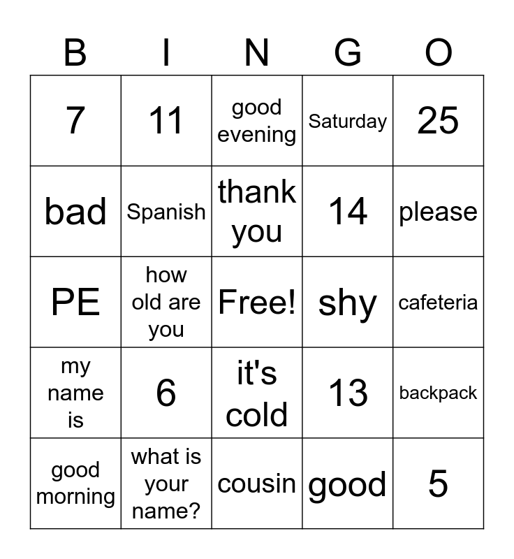 This bingo card has a free space and 113 words: calendar, Monday, Tuesday, Wednesday, Thursday, Friday, Saturday, Sunday, January, February, March, April, September, Octover, November, it's hot, it's cold, yesterday, today, tomorrow, good morning, good evening, goodbye, see you tomorrow, see you later, my name is, what is your name?, how are you, I am well, I am bad, please, thank you, how old are you, birthday, Iam ___ years old, hello, mean, friendly, funny, hard working, tall, short, pretty, ugly, handsome, lazy, good, bad, boring, big, small, shy, outgoing, dark hair, blond, red hair, old, young, pencil, a lot, backpack, paper, a little, Math, Science, Social Studies, lunch, Spanish, PE, English, cafeteria, 1, 2, 3, 4, 5, 6, 7, 8, 9, 10, 11, 12, 13, 14, 15, 16, 17, 18, 19, 20, 22, 25, 30, 31, teacher, student, friend, mom, dad, sister, brother, grandmother, grandfather, aunt, uncle, cousin, chocolate, telephone, family, important, artist and doctor.