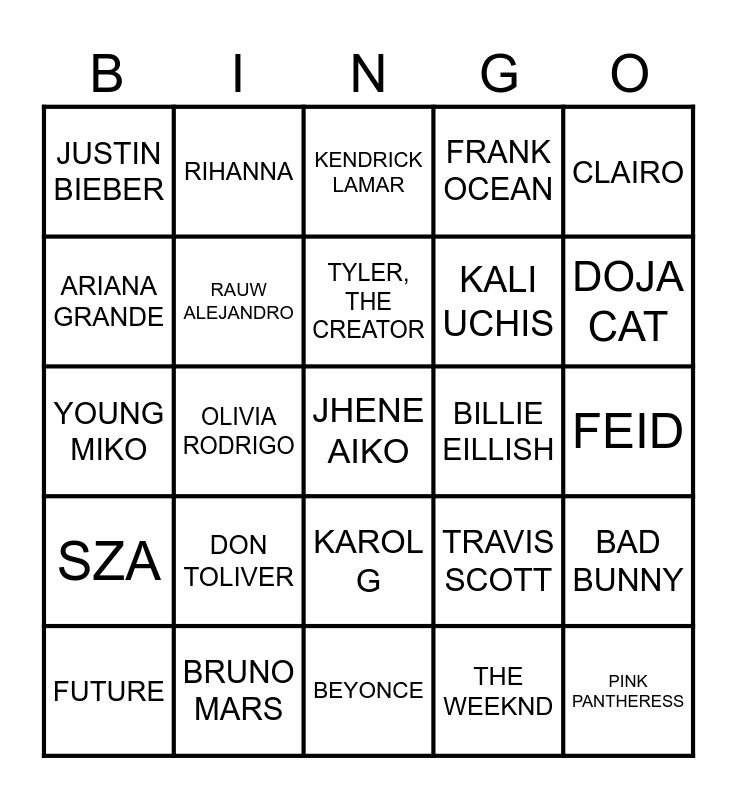This bingo card has 25 words: SZA, BRUNO MARS, JHENE AIKO, THE WEEKND, CLAIRO, JUSTIN BIEBER, RIHANNA, KENDRICK LAMAR, BILLIE EILLISH, BAD BUNNY, ARIANA GRANDE, RAUW ALEJANDRO, BEYONCE, TRAVIS SCOTT, DOJA CAT, FUTURE, OLIVIA RODRIGO, TYLER, THE CREATOR, KALI UCHIS, FEID, YOUNG MIKO, DON TOLIVER, KAROL G, FRANK OCEAN and PINK PANTHERESS.