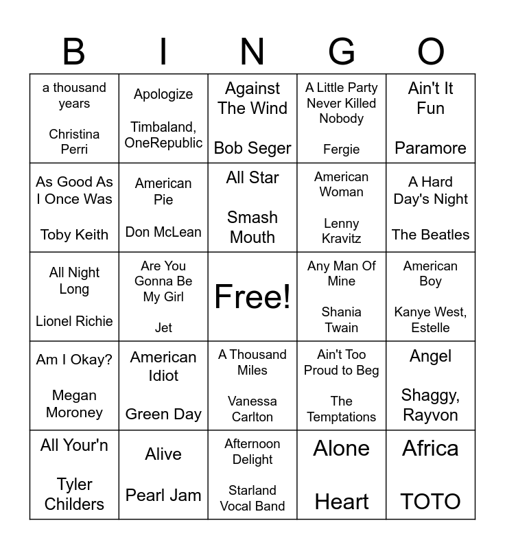 This bingo card has a free space and 66 words: All I Want For Christmas Is You Mariah Carey, Amazed Lonestar, Anti-Hero Taylor Swift, Angel Shaggy, Rayvon, A Bar Song Shaboozey, Another Day In Paradise Phil Collins, Apologize Timbaland, OneRepublic, All I Wanna Do Sheryl Crow, All Star Smash Mouth, Achy Breaky Heart Billy Ray Cyrus, A Thousand Miles Vanessa Carlton, All The Small Things blink-182, American Boy Kanye West, Estelle, Ain't It Fun Paramore, All Summer Long Kid Rock, As Good As I Once Was Toby Keith, Are You Gonna Be My Girl Jet, a thousand years Christina Perri, Accidentally In Love Counting Crows, American Woman Lenny Kravitz, American Idiot Green Day, Am I Okay? Megan Moroney, A Little Party Never Killed Nobody Fergie, Ain't No Rest For The Wicked Cage The Elephant, A Change Is Gonna Come Sam Cooke, A Boy Named Sue Johnny Cash, Ain't No Mountain High Enough Marvin Gaye, Tammi Terrell, ABC The Jackson 5, Africa TOTO, All Along the Watchtower Jimi Hendrix, All Your'n Tyler Childers, Another Brick in the Wall, Pt. 2 Pink Floyd, Ain't No Sunshine Bill Withers, Abracadabra Steve Miller Band, Ain't Too Proud to Beg The Temptations, Alive Pearl Jam, All-American Girl Carrie Underwood, All Night Long Lionel Richie, Alone Heart, American Girl Tom Petty and the Heartbreakers, American Pie Don McLean, Another One Bites The Dust Queen, Any Man Of Mine Shania Twain, Any Way You Want It Journey, Are You Gonna Kiss Me Or Not Thompson Square, At The Hop Danny & The Juniors, A Hard Day's Night The Beatles, Absolutely (Story of a Girl) Nine Days, All Too Well Taylor Swift, All You Need Is Love The Beatles, Alright Darius Rucker, All Right Now Free, Adorn Miguel, All I Do Is Win DJ Khaled, All My Ex's Live In Texas George Strait, All My Loving The Beatles, A Teenager In Love Dion & The Belmonts, A-Punk Vampire Weekend, Against The Wind Bob Seger, Afternoon Delight Starland Vocal Band, Always Something There to Remind Me Naked Eyes, Angel Eyes Love and Theft, APT. ROSE, Bruno Mars, Apache The Sugarhill Gang, As Long As You Love Me Justin Bieber, Big Sean and Axel F Crazy Frog.