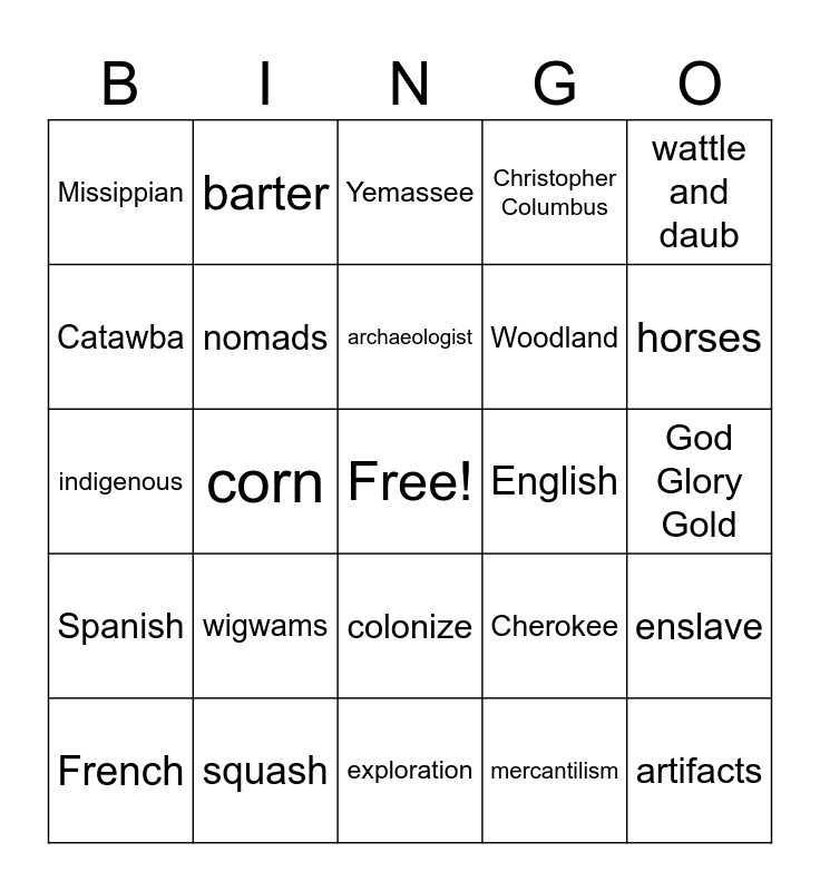 This bingo card has a free space and 24 words: wigwams, squash, archaeologist, French, wattle and daub, Missippian, Catawba, barter, English, colonize, Woodland, indigenous, Cherokee, enslave, nomads, mercantilism, God Glory Gold, Yemassee, horses, corn, artifacts, Spanish, Christopher Columbus and exploration.