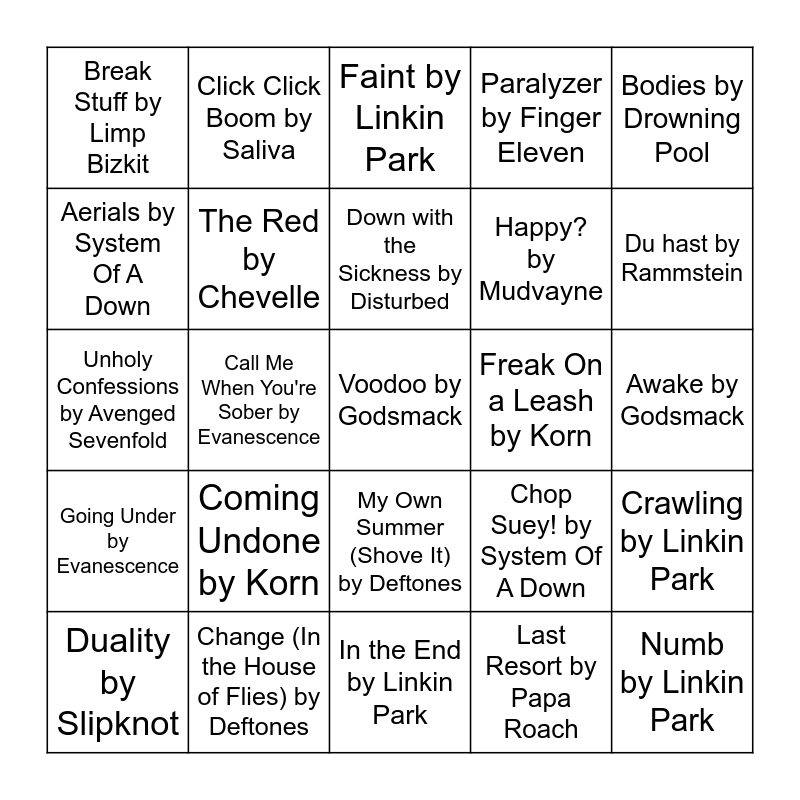 This bingo card has 41 words: Smooth Criminal by Alien Ant Farm, Unholy Confessions by Avenged Sevenfold, Bat Country by Avenged Sevenfold, The Red by Chevelle, Change (In the House of Flies) by Deftones, My Own Summer (Shove It) by Deftones, Down with the Sickness by Disturbed, Stricken by Disturbed, Bodies by Drowning Pool, Going Under by Evanescence, Call Me When You're Sober by Evanescence, Paralyzer by Finger Eleven, Voodoo by Godsmack, Awake by Godsmack, Freak On a Leash by Korn, Coming Undone by Korn, Falling Away from Me by Korn, Break Stuff by Limp Bizkit, Rollin' (Air Raid Vehicle) by Limp Bizkit, Faint by Linkin Park, Crawling by Linkin Park, Numb by Linkin Park, In the End by Linkin Park, Happy? by Mudvayne, Youth of the Nation by P.O.D., Boom by P.O.D., Last Resort by Papa Roach, Scars by Papa Roach, Du hast by Rammstein, Dragula by Rob Zombie, Living Dead Girl by Rob Zombie, Click Click Boom by Saliva, Duality by Slipknot, Push It by Static-X, Chop Suey! by System Of A Down, Aerials by System Of A Down, Deer Dance by System Of A Down, I Hate Everything About You by Three Days Grace, Stinkfist by TOOL, Sober by TOOL and Headstrong by Trapt.