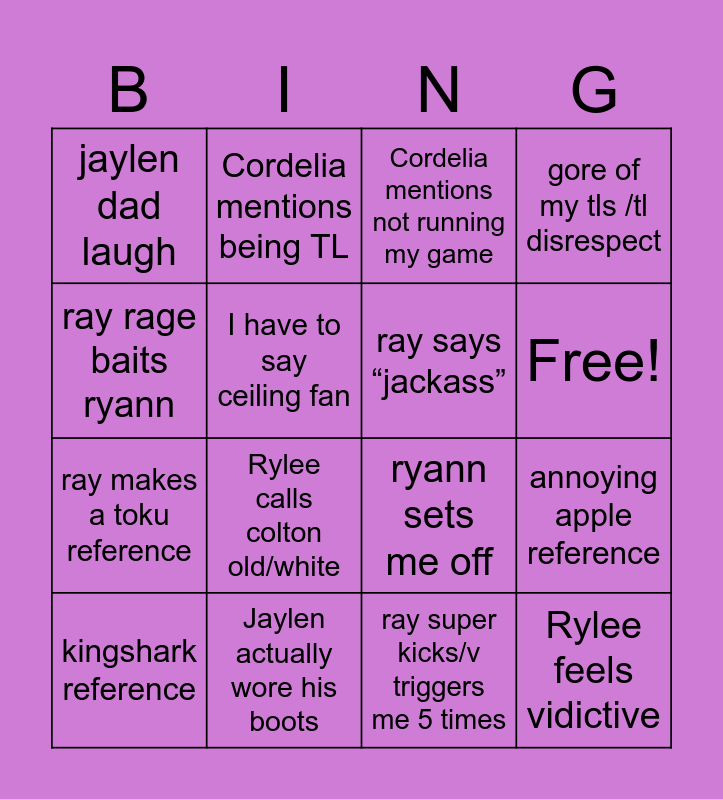This bingo card has 17 words: ray super kicks/v triggers me 5 times, kingshark reference, Cordelia mentions not running my game, jaylen dad laugh, Rylee calls colton old/white, gore of my tls /tl disrespect, annoying apple reference, ray says “jackass”, Free!, I have to say ceiling fan, Jaylen actually wore his boots, ryann sets me off, ray rage baits ryann, Cordelia mentions being TL, ray makes a toku reference, Robyn destroys ray in trivia showdown and Rylee feels vidictive.