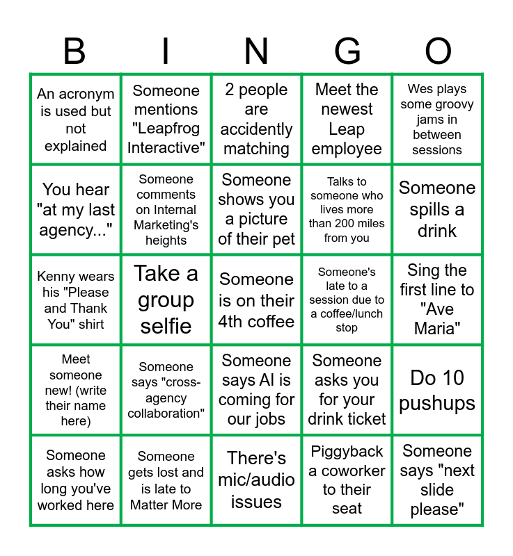 This bingo card has 36 words: Someone talks about Alan's goats, Talk to someone who has been at LEAP for 10 years, John recommends a trendy new Louisville spot, Someone comments on Internal Marketing's heights, Someone asks you for your drink ticket, Meet someone new! (write their name here), Someone shows you a picture of their pet, Talk to someone wearing Leap swag, Wes plays some groovy jams in between sessions, Technical glitch in the Matter More presentation, Take a group selfie, Meet the newest Leap employee, Kenny talks about coffee or ai (Free space), Someone's late to a session due to a coffee/lunch stop, Someone spills a drink, An acronym is used but not explained, Someone says "next slide please", Someone says "cross-agency collaboration", Someone is on their 4th coffee, 2 people are accidently matching, Sing the first line to "Ave Maria", Do 10 pushups, Someone gets lost and is late to Matter More, Someone asks how long you've worked here, There's mic/audio issues, Someone mentions "Leapfrog Interactive", Kenny wears his "Please and Thank You" shirt, Work "Its a party in the USA" into a conversation, Talks to someone who lives more than 200 miles from you, You hear "at my last agency...", Meet someone you've only seen on Teams, Take a selfie with someone from each agency, Piggyback a coworker to their seat, Someone says AI is coming for our jobs, Someone asks "when's lunch?" and Arm wrestle your boss and win.