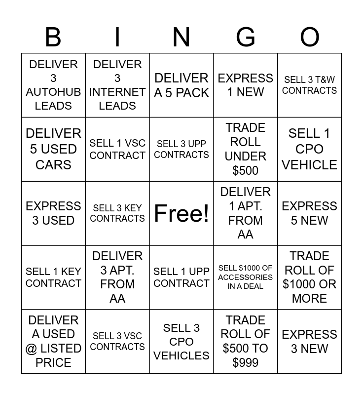 This bingo card has a free space and 40 words: EXPRESS 1 USED, EXPRESS 3 USED, EXPRESS 5 USED, SELL 1 VSC CONTRACT, SELL 3 VSC CONTRACTS, SELL 1 UPP CONTRACT, SELL 3 UPP CONTRACTS, SELL 1 T&W CONTRACT, SELL 3 T&W CONTRACTS, SELL 1 KEY CONTRACT, SELL 3 KEY CONTRACTS, EXPRESS 1 NEW, EXPRESS 3 NEW, EXPRESS 5 NEW, DELIVER 1 APT. FROM AA, DELIVER 3 APT. FROM AA, DELIVER 1 AUTOHUB LEAD, DELIVER 3 AUTOHUB LEADS, EXPRESS A LOT UP, DELIVER A 5 PACK, TRADE ROLL OF $1000 OR MORE, TRADE ROLL OF $500 TO $999, TRADE ROLL UNDER $500, DELIVER 5 USED CARS, DELIVER 8 USED CARS, DELIVER 7 NEW CARS, DELIVER 10 NEW CARS, DELIVER 15 NEW CARS, DELIVER A EV VEHICLE, DELIVER 3 EV’S, DELIVER A NEW STICKER DEAL, DELIVER A USED @ LISTED PRICE, EXPRESS 3 IN ONE DAY, SELL $1000 OF ACCESSORIES IN A DEAL, SELL 1 CPO VEHICLE, SELL 3 CPO VEHICLES, MAKE A 2 CAR DEAL, DELIVER 1 INTERNET LEAD, DELIVER 3 INTERNET LEADS and 50 AA APTS W/ 5 SHOWS IN A WEEK.