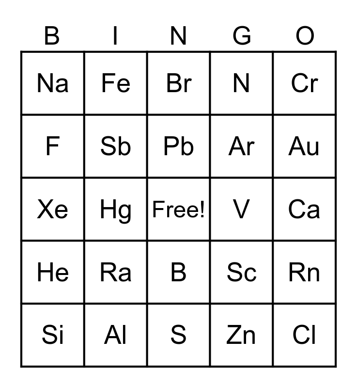 This bingo card has a free space and 54 words: H, He, Li, Be, B, C, N, O, F, Ne, Na, Mg, Al, Si, P, S, Cl, Ar, K, Ca, Sc, Ti, V, Cr, Mn, Fe, Co, Ni, Cu, Zn, Ga, Ge, As, Se, Br, Kr, Xe, Rn, Og, Sb, Rb, Cs, Sr, Ba, Ra, Zr, Ag, Sn, Pb, Hg, Au, Pt, W and Pu.