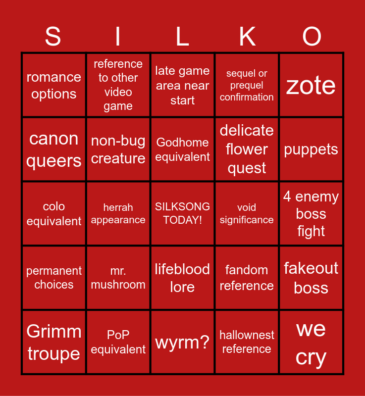 This bingo card has a free space and 24 words: mr. mushroom, PoP equivalent, Godhome equivalent, Grimm troupe, zote, romance options, canon queers, reference to other video game, void significance, lifeblood lore, delicate flower quest, colo equivalent, fandom reference, fakeout boss, non-bug creature, hallownest reference, 4 enemy boss fight, late game area near start, puppets, herrah appearance, we cry, permanent choices, sequel or prequel confirmation and wyrm?.