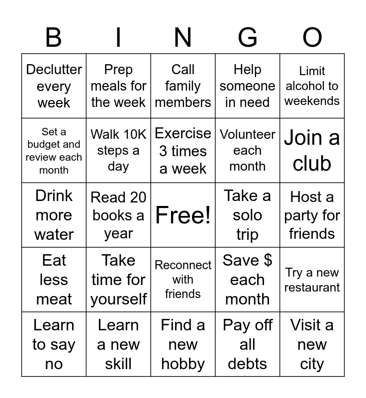 This bingo card has a free space and 24 words: Take time for yourself, Learn a new skill, Exercise 3 times a week, Learn to say no, Limit alcohol to weekends, Declutter every week, Set a budget and review each month, Prep meals for the week, Take a solo trip, Reconnect with friends, Volunteer each month, Drink more water, Save $ each month, Try a new restaurant, Walk 10K steps a day, Pay off all debts, Host a party for friends, Call family members, Join a club, Read 20 books a year, Visit a new city, Eat less meat, Help someone in need and Find a new hobby.