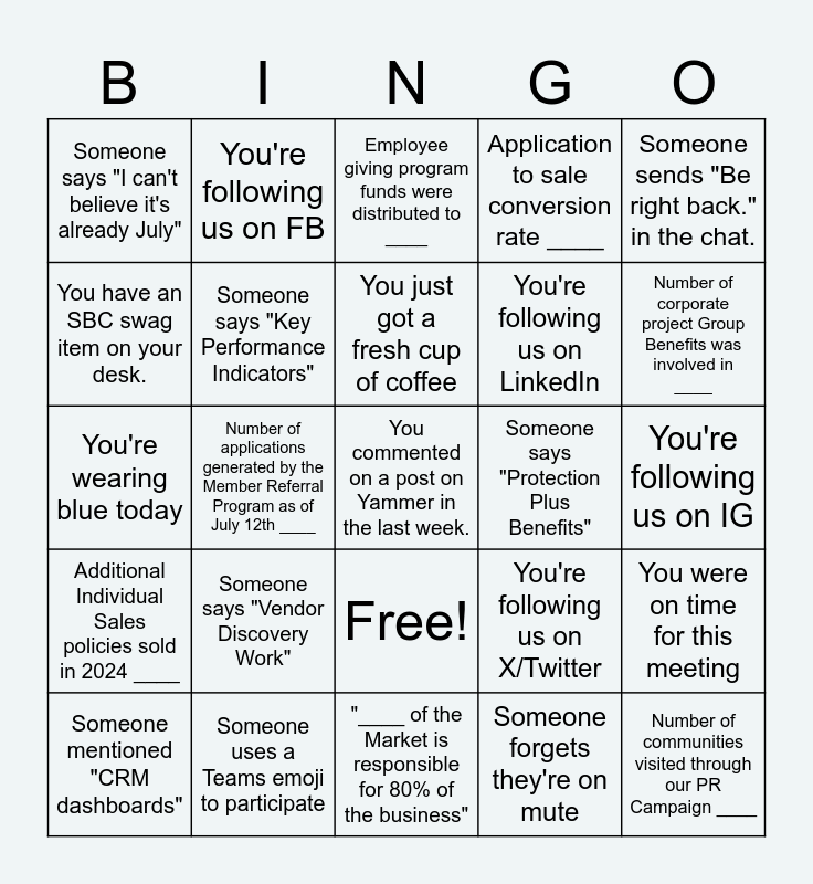 This bingo card has a free space and 26 words: Free!, Someone forgets they're on mute, You just got a fresh cup of coffee, Someone uses a Teams emoji to participate, Someone sends "Be right back." in the chat., Someone says "I can't believe it's already July", You have an SBC swag item on your desk., You're following us on FB, You're following us on IG, You're following us on X/Twitter, You're following us on LinkedIn, You're wearing blue today, You were on time for this meeting, Someone mentioned "CRM dashboards", Number of applications generated by the Member Referral Program as of July 12th ____, Number of marketing leads generated by Wellness Guide____, Application to sale conversion rate ____, Additional Individual Sales policies sold in 2024 ____, Employee giving program funds were distributed to ____, Number of communities visited through our PR Campaign ____, Number of corporate project Group Benefits was involved in ____, "____ of the Market is responsible for 80% of the business", Someone says "Protection Plus Benefits", Someone says "Vendor Discovery Work", Someone says "Key Performance Indicators" and Someone mentions CE accredited courses.