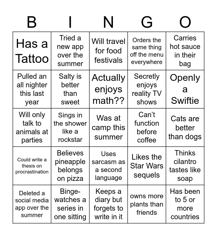 This bingo card has a free space and 24 words: Believes pineapple belongs on pizza, Binge-watches a series in one sitting, Actually enjoys math??, Deleted a social media app over the summer, Carries hot sauce in their bag, Has a Tattoo, Pulled an all nighter this last year, Tried a new app over the summer, Can’t function before coffee, Uses sarcasm as a second language, Secretly enjoys reality TV shows, Will only talk to animals at parties, Likes the Star Wars sequels, Thinks cilantro tastes like soap, Salty is better than sweet, owns more plants than friends, Cats are better than dogs, Will travel for food festivals, Openly a Swiftie, Sings in the shower like a rockstar, Has been to 5 or more countries, Could write a thesis on procrastination, Orders the same thing off the menu everywhere and Keeps a diary but forgets to write in it.