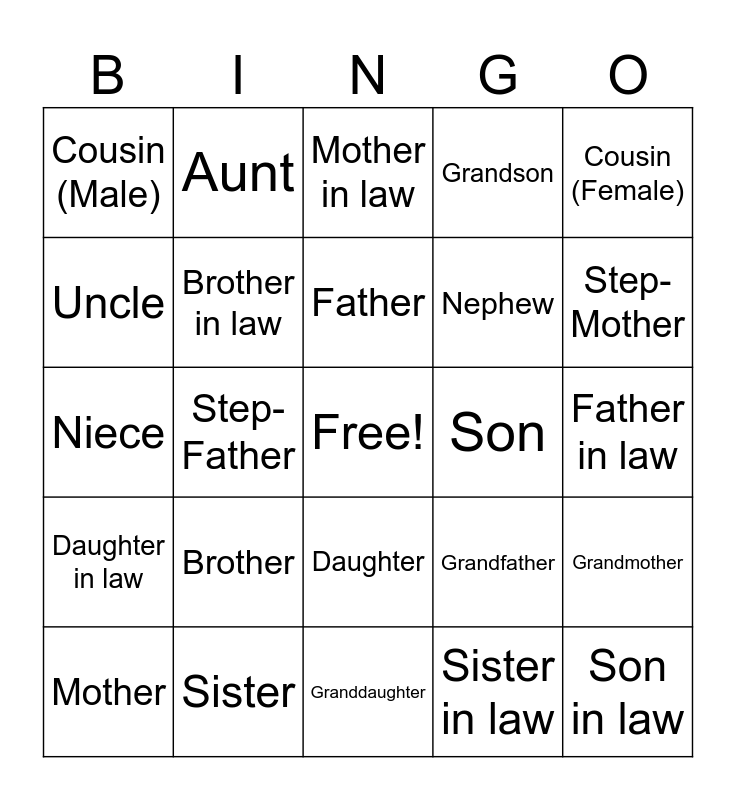 This bingo card has a free space and 24 words: Brother, Sister, Father, Mother, Cousin (Female), Cousin (Male), Uncle, Aunt, Son, Daughter, Nephew, Niece, Grandfather, Grandmother, Brother in law, Sister in law, Father in law, Mother in law, Step-Mother, Step-Father, Son in law, Daughter in law, Grandson and Granddaughter.